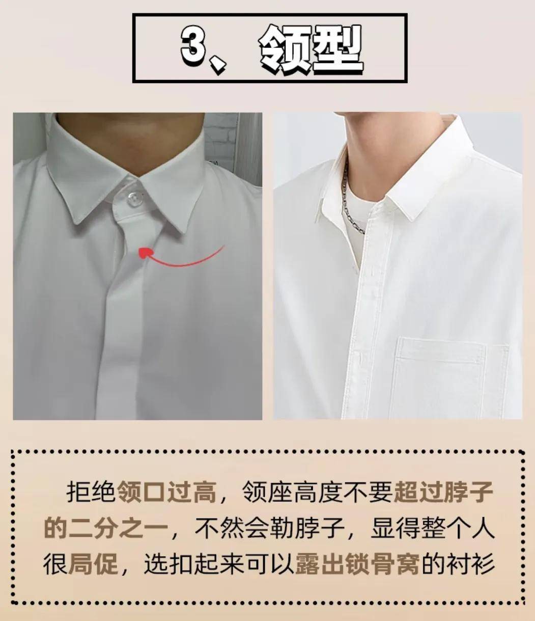 tips1)领型遴选:模范领最庄重,稍宽的领口适合脸部详尽显着的男士;圆形领适合方脸,能弱化脸部线条。