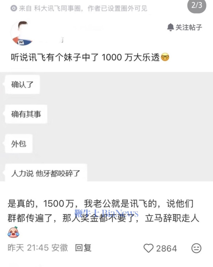 有科大讯飞的共事在酬酢集聚平台默示,单元的别称女共事中了1000万彩票。