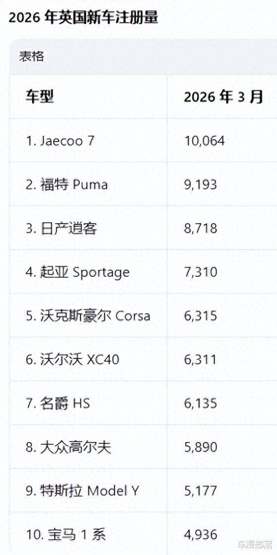 最近地球不是很太平,导致漫哥开的那台油老虎都不敢动了。测度英国那旮瘩的东谈主也相似情况,是以对新能源车越来越意思意思。在最近的英国3月汽车销量榜单上,显着一台插混车型登顶,一台叫Jaecoo 7的车以10064辆,击败了福特、日产、全球、起亚、MG、沃尔沃等一众强敌。