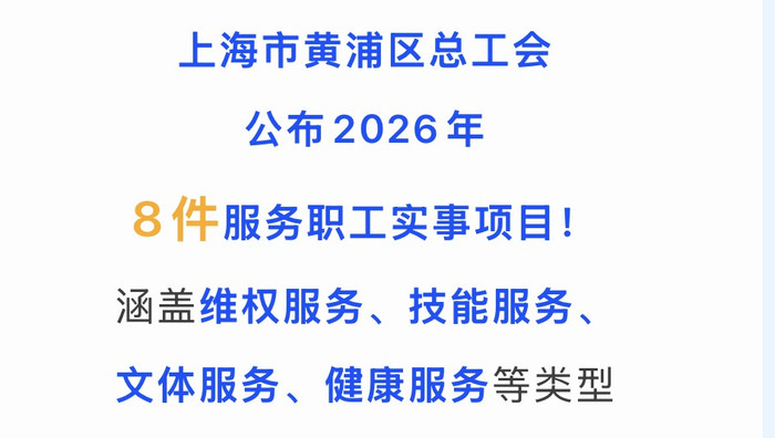 日前,黄浦区总工会公布2026年8件服务员工实事样式,8件实事样式涵盖维权服务、妙技服务、文学服务、健康服务等类型。