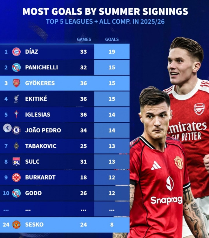 直播吧2月24日讯曼联在本轮英超客场1-0小胜埃弗顿,舍什科替补打进制胜球。德转数据统计泄露,舍什科现时位列本赛季五大联赛新援进球榜第24位。