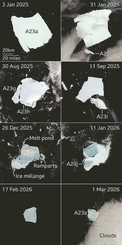 到2023年头,A23a的面积仍然有4035日常公里,仍被吉尼斯天下记载认定为那时“大家最大的冰山”。但只是曩昔三年,这座高大的冰山主体部分面积便只剩35.2日常公里。