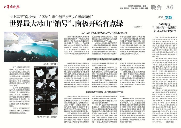 南极大陆长久以来险些皆只好蓝白两色(蓝色的海洋与白色的冰川)。从2025年底起,商议者却不雅测到A23a落空冰区逐渐出现“变绿”迹象。这些“绿色羽流区”正约束发展变化,商议分析称,这与冰山溶解导致海洋藻华爆发(注:水体中浮游植物爆发性增殖导致水体神采更动的当然现象)密不行分。