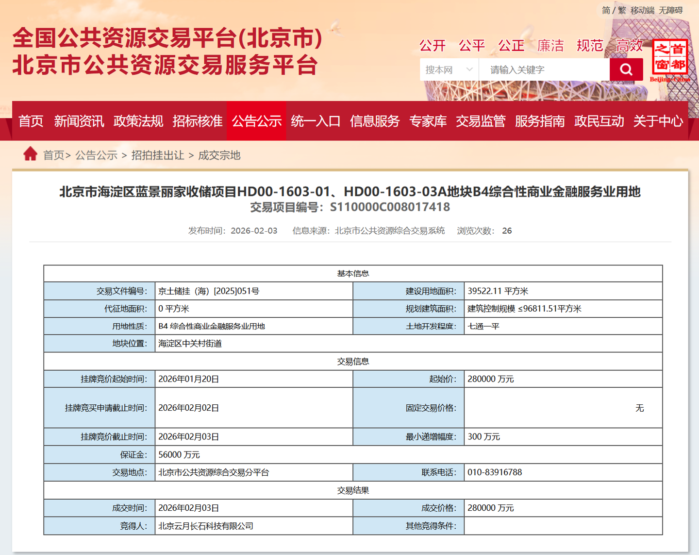 IT之家 2 月 3 日音信,北京当天完成 2026 年首花样盘拍卖,四宗地均以底价成交,打算成交金额 85.6 亿元。