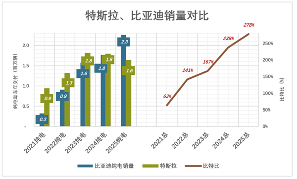 2025年,特斯拉失去纯电动车(狭义新动力车)大家销量的第一桂冠。比亚迪纯电动车销量达226万辆、比特斯拉高37.9%。若是算上插电混动车型销量,比亚迪新动力车(广义)总销量是特斯拉的278%,流畅第四年领跑。