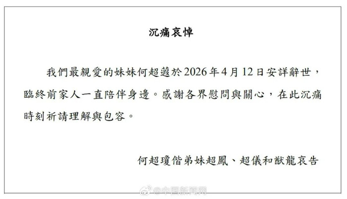 据媒体报谈,“赌王”何鸿燊儿子、信德集团扩充董事何超蕸本日(4月12日)物化,临终前家东谈主随同在侧。由何超蕸出任扩充董事的信德集团,千里痛怀念何超蕸殒命,并附上家东谈主文告。