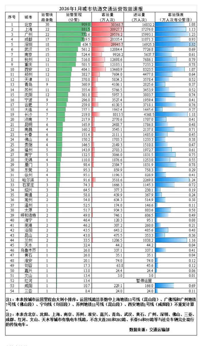 “交通运载部”微信号发布2026年1月城市轨谈交通运营数据速报。2026年1月,31个省(自治区、直辖市)和新疆坐褥开发兵团共有54个城市通达运营城市轨谈交通清爽345条,运营里程11767.3公里,施行开行列车380万列次,完成客运量28.9亿东谈主次,进站量17.2亿东谈主次。
