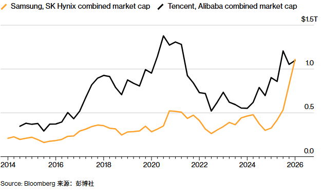 IT之家 2 月 3 日音问,据彭博社报谈,韩国市值最高的两家企业,其总市值行将初度高出中国互联网双巨头,这一变化突显出各人东谈主工智能激越的演进,怎么重塑了亚洲科技行业的投经历局。