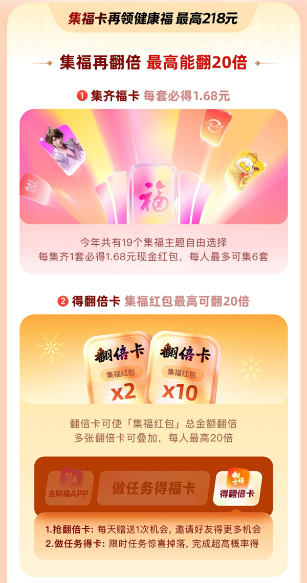 本次集福共推出19套主题福卡,涵盖经典五福与游戏、潮玩、影视等多界限IP,用户可任选6套主题福卡来集,每集皆一套得1.68元红包。